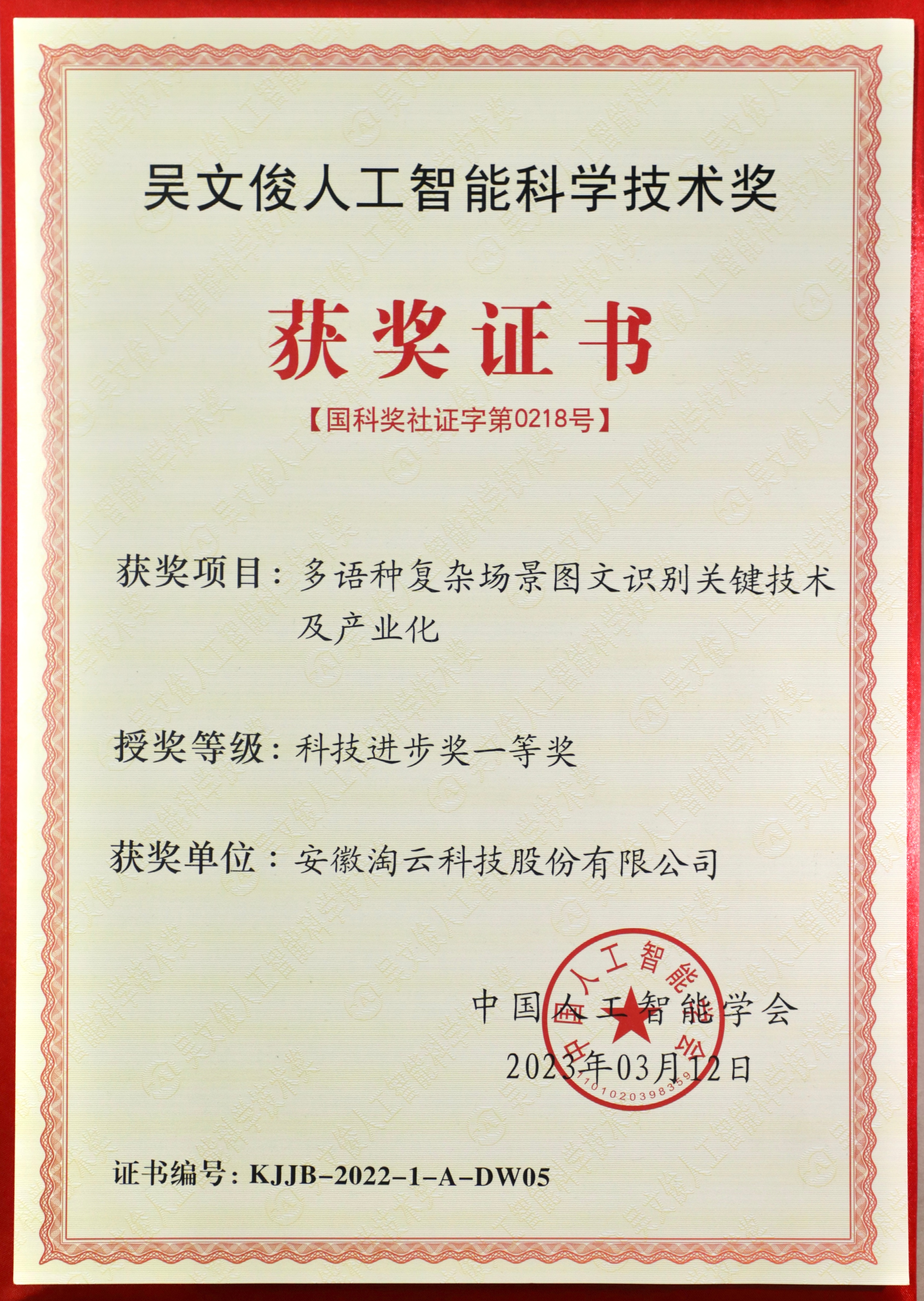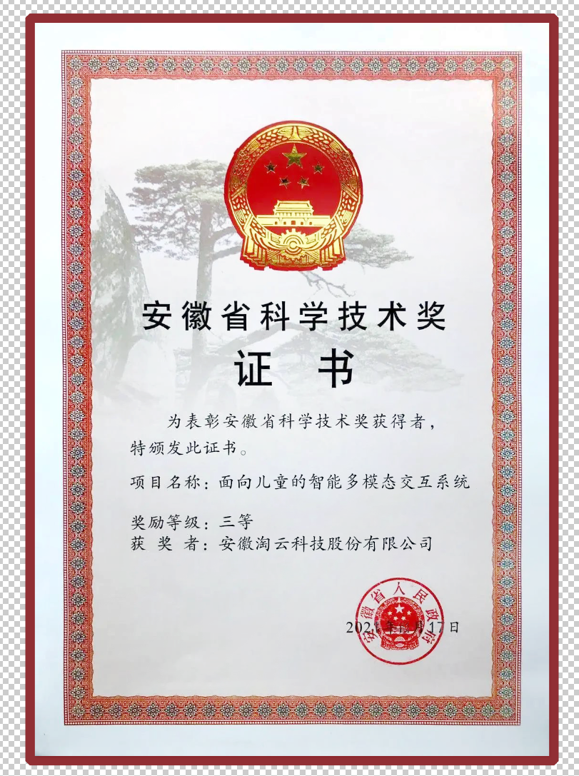淘云科技荣获安徽省人工智能技术奖一等奖